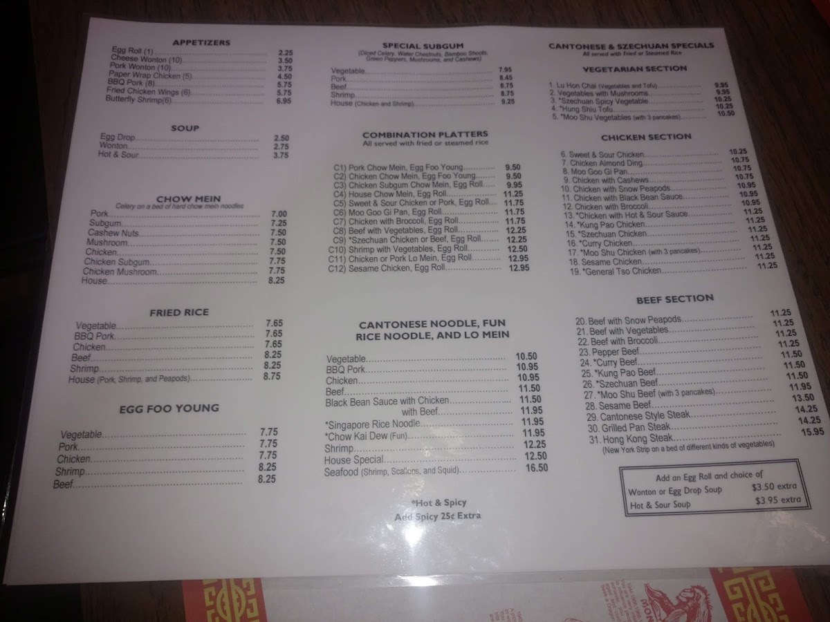 The menu at Cheung’s Garden Restaurant features a variety of traditional Chinese dishes categorized into appetizers, egg foo young, and vegetarian options. The appetizer selection includes items such as egg rolls, cheese wontons, pork wontons, paper-wrapped chicken, BBQ pork, fried chicken wings, and butterfly shrimp. The egg foo young section offers shrimp, pork, and chicken versions. For those seeking plant-based choices, the vegetarian section includes dishes like Lu Hon Chai and vegetables with mushrooms.